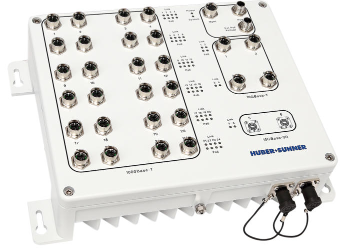 Bis zu 6x 10GBase-T-Uplinks über M12-x-codierten Stecker – optional mit bis zu 2x2